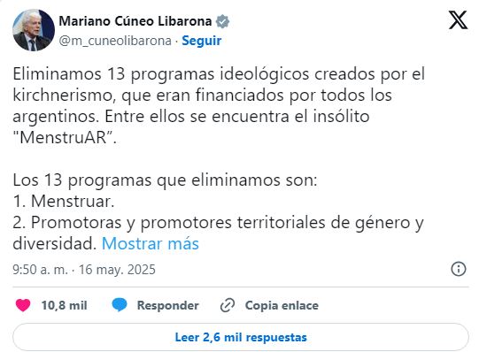 Las políticas que ya no existen tenían que ver con, por ejemplo, la promoción de la igualdad, la capacitación en género y diversidades, la prevención o protección para quienes sufren violencia de género y acceso a derechos para personas trans. Puntualmente, a través del Programa MenstruAR, se entregaban copas menstruales a municipios de todo el país para garantizar el acceso igualitario de las personas menstruantes a insumos de gestión menstrual. Además, se promovía el cuidado ambiental a través de la utilización de productos sustentables como toallitas reutilizables y copas, entre otras. Según Cúneo Libarona, la eliminación de este y otros programas, calificados de despilfarros absurdos, permitirá ahorrar 6 mil millones de pesos; así el gobierno busca enfocar los recursos en políticas de “mayor impacto y eficiencia” y “optimizar el gasto público”.